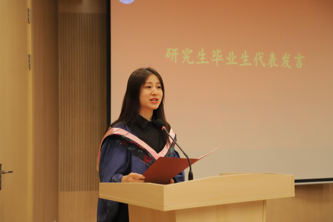 2021级研究生毕业生康月佳代表全体研究生毕业生向学院和各位老师致以崇高的敬意与感谢。她表示将与新时代同行,以奔跑的姿态诠释青春,以坚定的理想塑造未来。