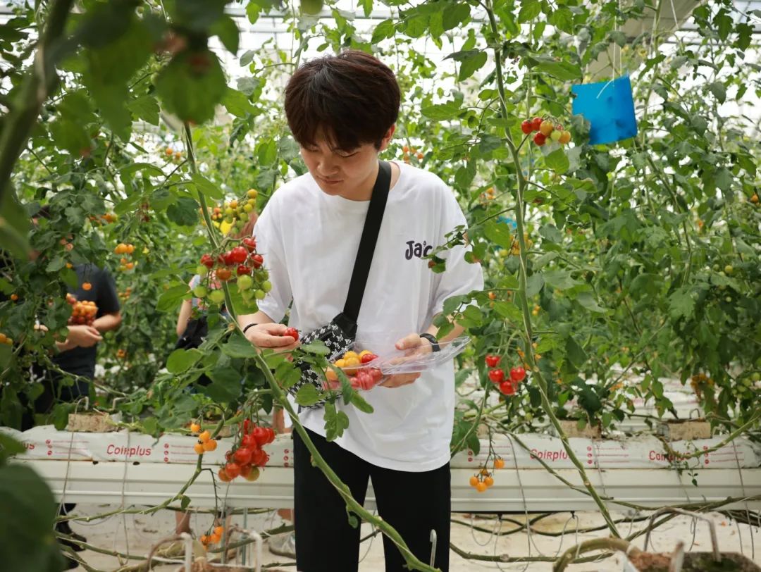 夏日采摘乐趣多。随后,师生们纷纷跃跃欲试,在工作人员的指引下,大家在垄垄翠绿的植株间采摘小番茄、黄瓜等新鲜瓜果,在劳动实践中感受自然的田园野趣,同时也更加深入地感受到劳动的艰辛与丰收的喜悦。