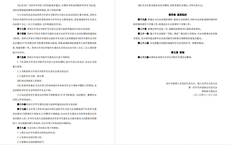 2020年12月16日,苏州大学音乐学院第八次学生代表大会在音乐学院二楼报告厅顺利召开,正式会议中,大会选举产生了第八届学生委员会、审议通过了《学生会章程修正案》等其他报告。