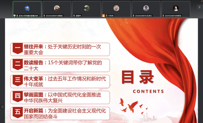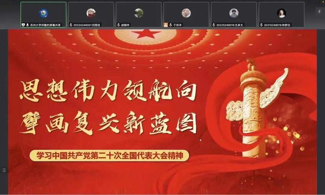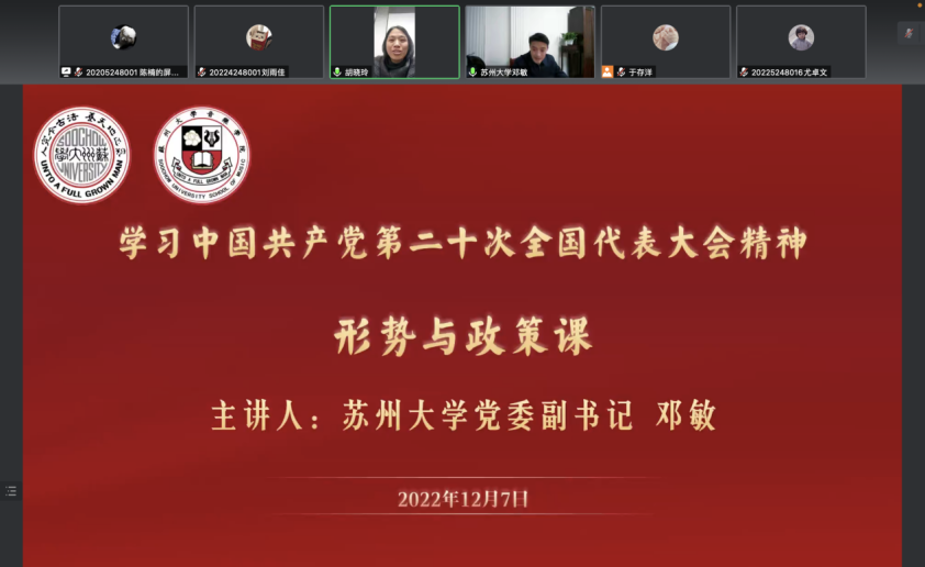 最后,邓书记强调青年强则国家强,当代大学生要肩负起历史使命,增强文化自信,要坚定不移听党话、跟党走、怀抱梦想又脚踏实地,敢想敢为又善作善成,立志做有理想、敢担当、能吃苦、肯奋斗的新时代好青年,为全面建设社会主义现代化国家而团结奋斗。作为新时代的青年学子,应该不断增强志气、骨气、底气,持续提升自尊心、自信心、自豪感。从党的百年奋斗历程中不断汲取智慧力量,厚植爱党爱国爱社会主义的情怀,为实现中华民族伟大复兴贡献青春力量。大家要把学习宣传贯彻好党的二十大精神作为首要政治任务,系统谋划、分步推进,切实把党的二十大精神转化为苏州大学“双一流”建设的根本指引,奋力推进苏州大学事业发展再上新台阶。