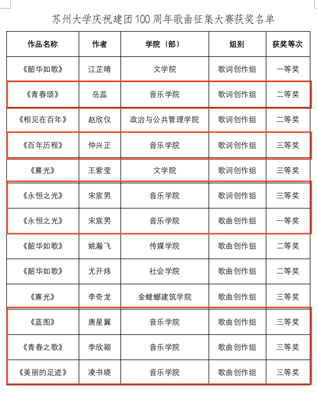 为深入学习贯彻习近平新时代中国特色社会主义思想,团结和凝聚青年力量,生动展现苏大青年百年来紧跟党走、接续奋斗的光荣历程和新时代不负韶华、开拓创新的精神风貌,音乐学院积极组织学生参加学校举办的庆祝建团100周年歌曲征集大赛,向大赛组委会提交12首原创作品。经评委老师严格筛选,最终产生13部获奖作品,其中7部为我院学生作品。宋宸男创作的歌曲《永恒之光》作为苏州大学庆祝中国共青团成立100周年主题曲在苏州大学官微上发布。