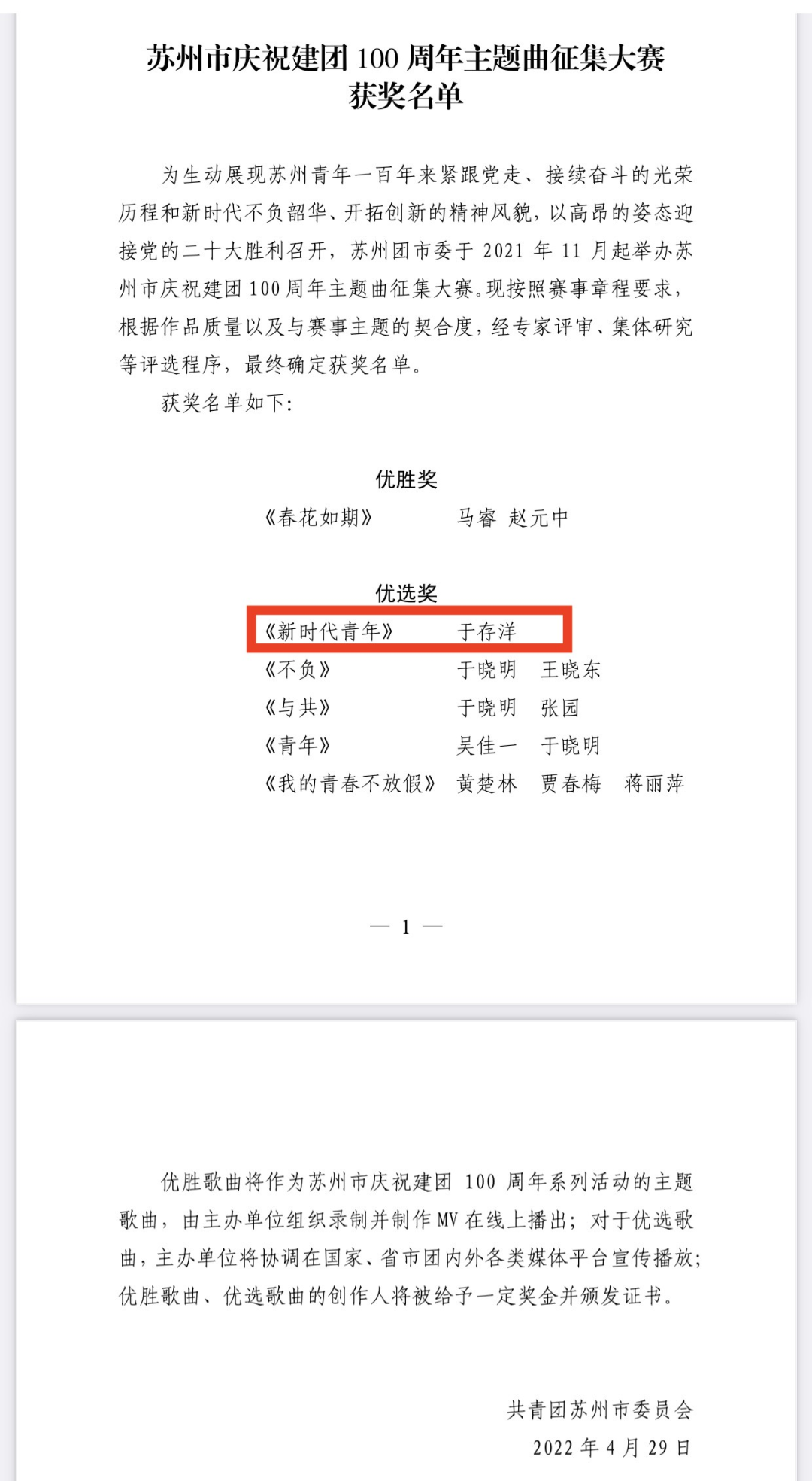 音乐学院团委书记于存洋原创歌曲《新时代青年》通过欢快的旋律唱出了百年来,一代又一代中国青年紧跟党走、接续奋斗,在青春赛道上奋力奔跑,用汗水谱写一曲又一曲青春之歌的勇敢与担当,展现了新时代青年开拓创新、勇于追梦、昂扬向上的精神风貌。歌曲获苏州市庆祝建团100周年主题曲征集大赛“优选奖”。