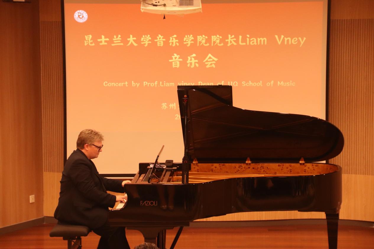 下午,Liam院长在二楼报告厅举办音乐会。Liam院长带来了一首改编的中国古琴乐曲《阳关三叠》,一首澳大利亚作曲家创作的钢琴乐曲《Piano Sonata 1》。这两首乐曲,一静一动,一古一今,时空在钢琴键上变换,娓娓诉说着此次联合活动日两院乃至中澳的友谊。音乐会现场座无虚席,每首乐曲落幕,都传来热烈的掌声。