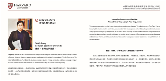 2018年5月29日、30日,由哈佛大学主办的“中国当代音乐多维研究学术研讨会” 在上海的哈佛中心举行,来自中国、中国香港、美国、加拿大等不同国家和地区的作曲家、理论家以及青年学者围绕“传统与当代、继承与创新、分析与理论”展开交流与对话。我院教师唐荣博士受邀参加此次会议,并在大会上发表了题为“Integrating, Innovating andLeading: An Analysis of Yang Liqing’s FourTang poems”的论文。