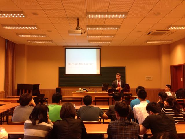今年10月10日,我院Matthias Lang教授作为主讲人在上海音乐学院举办了吉他学术讲座:《Bach on the Guitar: Principles and Examples of an applied Baroque Sound》。在讲座过程中,Matthias Lang教授一边讲解,一边用吉他示范了一些具体的音乐片段。之后,他又为参加讲座的叶登民教授和学生们演奏了他自己为吉他改编的《巴赫无伴奏小提琴组曲第二号(BWV1003)》。
