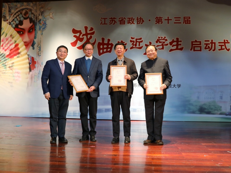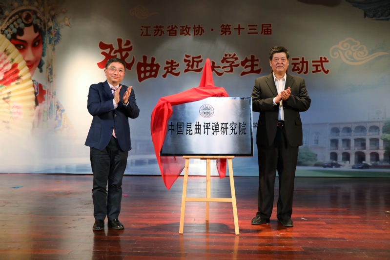 3月13日晚,在独墅湖校区举办的江苏省政协·第十三届“戏曲走近大学生”启动式上,江苏省政协副主席周继业和苏州大学党委书记江涌为苏州大学中国昆曲评弹研究院揭牌,同时江涌为研究院顾问顾浩、陆军、执行院长朱栋霖颁发聘书。