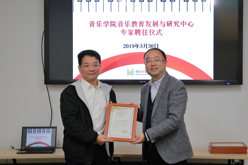 3月30日上午,苏州大学音乐学院音乐教育发展与研究中心专家聘任仪式在音乐学院一楼会议室举行。聘请湖南师范大学教授、博士生导师、教育部艺术教育委员会副秘书长郭声健为音乐教育发展与研究中心首席专家,聘请江苏省音乐教研员潘丽琴、苏州市教育局体卫艺处处长江莉、苏州市音乐教研员王欢、吴中区音乐教研员高谊、工业园区音乐教研员朱岚为音乐教育发展与研究中心特聘专家。音乐学院执行院长吴磊、党委副书记兼副院长胡晓玲、音乐教育发展与研究中心主任兼钢琴系副主任冒小瑛、学生办公室主任张晶、苏州大学合唱团团长兼艺术总监李长松共同参加本次受聘仪式。本次聘任仪式由音乐学院执行院长吴磊主持。